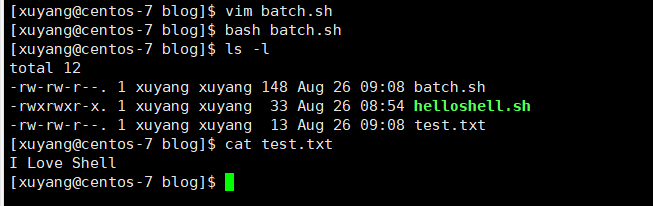 例 2、创建一个脚本,使其在用户目录下创建一个 test.txt,并向该文件中追加内容“I Love Shell”。