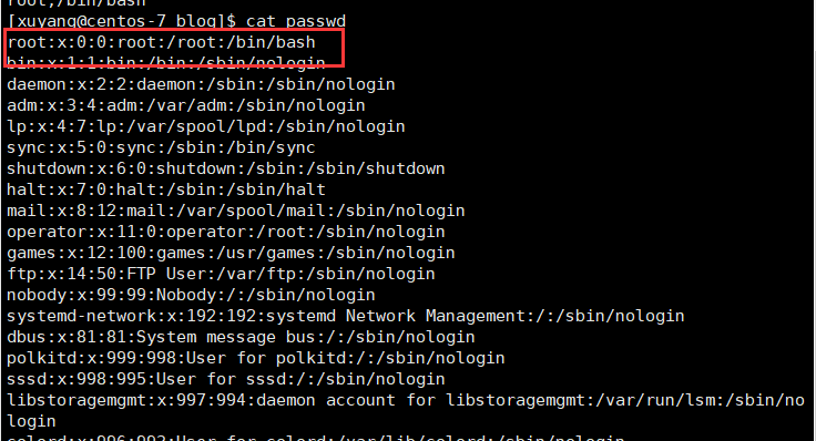 例 31、只输出 /etc/passwd 文件的第 1 列和 7 列,且用逗号将其隔开,并在文件开头添加一行数据 "user,data",在文件最后添加一行数据 "xuyang,/bin/zuishuai"。