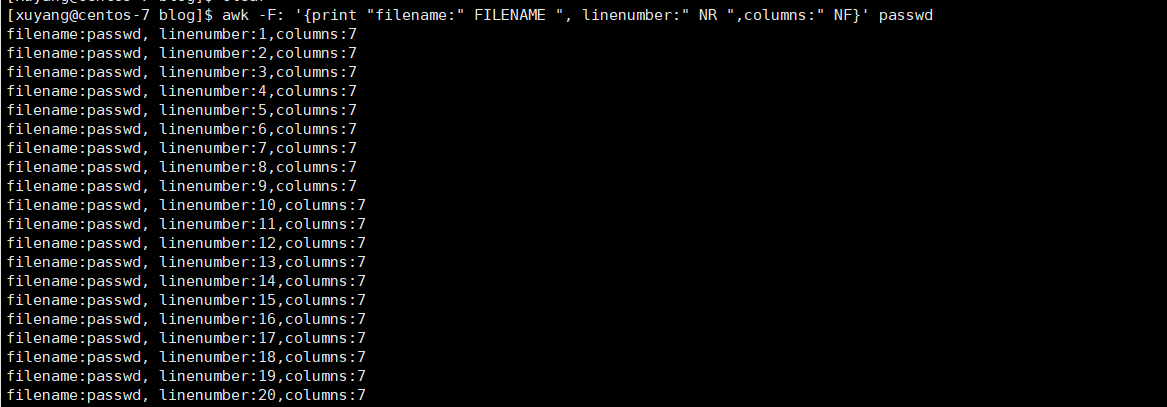 awk -F: '{print "filename:" FILENAME ", linenumber:" NR ",columns:" NF}' passwd