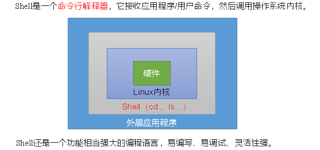 Shell 命令解释器外层是我们用户和外层的应用程序,我们用户或者应用程序的命令或者变成都是字符串类型,我们把这些传递给 Shell 命令解释器,由它把这些字符串转变为计算器语言并发送给内核执行并把执行的结果从计算机语言转化为我们能看懂的字符串传递给我们。
